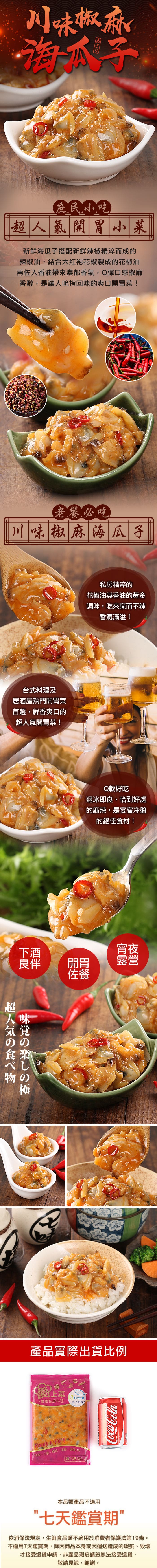 商品成分:海瓜子、花椒油【大豆油、大紅袍花椒、抗氧化劑(混合濃縮生育醇)】、液糖【糖(果糖、葡萄糖)、水】、辣椒油(大豆油、花椒油、辣椒萃取物)、鹽、糖、香油(芝麻油、大豆油)、味醂(果糖、水、糯米、米麴、鹽)、芝麻、L-麩酸鈉、辣椒粉、辣椒、玉米糖膠、5’-次黃嘌呤核苷磷酸二鈉、5’-鳥嘌呤核苷磷酸二鈉。