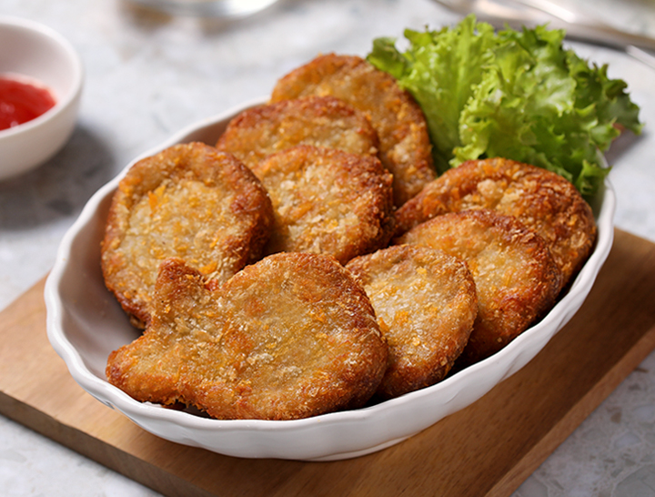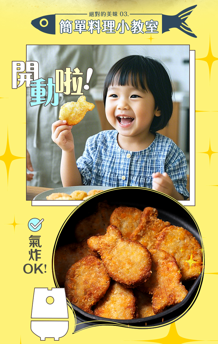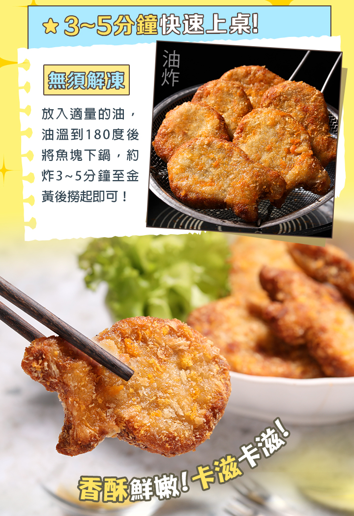 食用方式:不需解凍,氣炸200°C約3分鐘,等產品變成金黃色,即可食用。