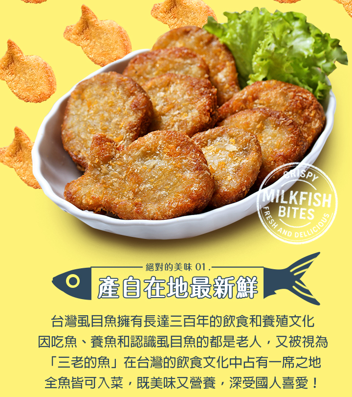商品成分:虱目魚肉、水、麵包油炸粉{麵粉【小麥、L-抗壞血酸(抗氧化劑)】、水、精製棕櫚油【棕櫚油、香料、混合濃縮生育醇(抗氧化劑)】、鹽、黃豆粉、酵母、玉米澱粉、硫酸鈣、碳酸氫銨製劑(碳酸氫銨、碳酸鎂)、L-抗壞血酸(抗氧化劑)、酵母抽出物、食用黃色四號、食用黃色五號、精製椰子油}、調合油【棕櫚油、大豆沙拉油、芥花油、消泡劑(矽樹脂)】、酥漿粉【黏稠劑(磷酸二澱粉)、玉米澱粉、黏稠劑(乙醯化己二酸二澱粉)、大豆油】、洋蔥、炸酥粉【麵粉、黏稠劑(磷酸二澱粉)、蛋白粉(雞蛋)、食鹽】、分離大豆蛋白(非基因改造黃豆)、蔗糖、蒜、米霖(糯米、米麴、果糖、水、釀造醋、食鹽)、食鹽、小麥纖維、調味劑(L-麩酸鈉)、洋蔥粉、蒜粉(大蒜粉、麥芽糊精、辣椒、大蒜萃取物)、白胡椒、結著劑(多磷酸鈉、焦磷酸鈉)、黑胡椒、調味劑(5'-鳥嘌呤核苷磷酸二鈉、5'-次黃嘌呤核苷磷酸二鈉)。