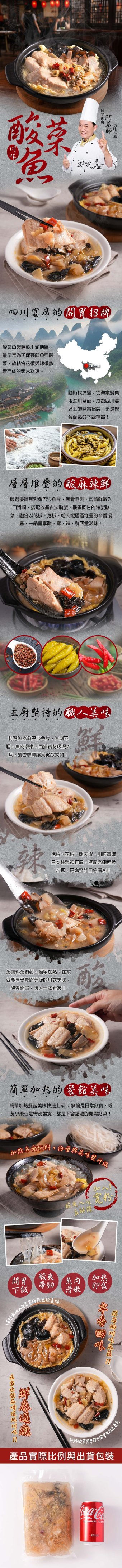 產品成分:水、巴沙魚、酸菜(芥菜、鹽、水)、杏鮑菇、木耳、大豆沙拉油、白醋(水、米、釀造酢、果糖)、辣油(大豆油、辣椒粉、辣椒萃取物、辣椒紅色素)、蒜仁、薑、泡椒、花椒、朝天椒、鹽、二砂、大骨風味高湯粉【鹽、L-麩酸鈉、麥芽糊精、糖、玉米澱粉、香料、棕櫚油(棕櫚油、硬質棕櫚油)、酵母萃取物 (酵母萃取物、鹽)、豬肉粉 [豬肉(台灣)、鹽、多磷酸鈉、複合調味劑(乳糖、DL-胺基丙酸、調味劑( 5'-次黃嘌呤核苷磷酸二鈉、5'-鳥嘌呤核苷磷酸二鈉)、胺基乙酸、琥珀酸二鈉、檸檬酸鈉)、糖、維生素E (抗氧化劑)]、洋蔥粉、5'-次黃嘌呤核苷磷酸二鈉、5'-鳥嘌呤核苷磷酸二鈉、明膠、白胡椒】