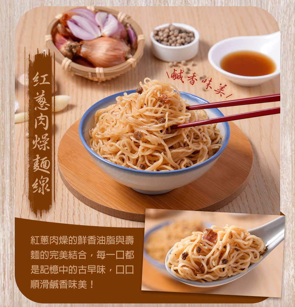 成分:麵線【麵粉、水、羥丙基磷酸二澱粉、食鹽、小麥蛋白、甘油、蛋白粉、品質改良劑(植物性蛋白(小麥)、小麥蛋白水解物)、海藻糖、無水碳酸鈉、抗氧化劑(異抗壞血酸鈉)、氧化鈣】、精製豬油(豬油(西班牙)、抗氧化劑(混合濃縮生育醇、L-抗壞血酸棕櫚酸酯))、紅蔥、豬絞肉(台灣)、醬油、蒜、食鹽、紅蔥肉燥調味粉(糖、美味粉(L-麩酸鈉 、琥珀酸二鈉、5 -次黃嘌呤核苷磷酸二鈉 、5 -鳥嘌呤核苷磷酸二鈉 、DL -胺基丙酸)、胡椒粉(甘薯粕粉、辣椒、花椒、小茴香、鹽、薑黃、胡椒、香料)、鮮味粉(胺基乙酸、鹽、L-天門冬酸鈉、琥珀酸二鈉、5'-鳥嘌呤核苷磷酸二鈉、5'-次黃嘌呤核苷磷酸二鈉)、紅辣椒粉)、芝麻香油(大豆油、芝麻油)