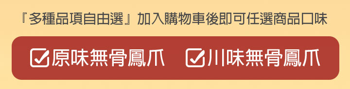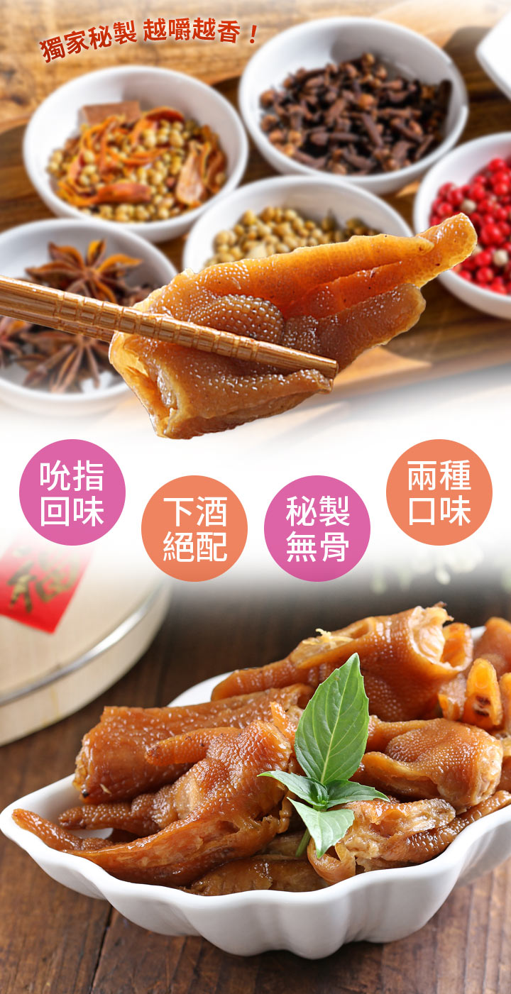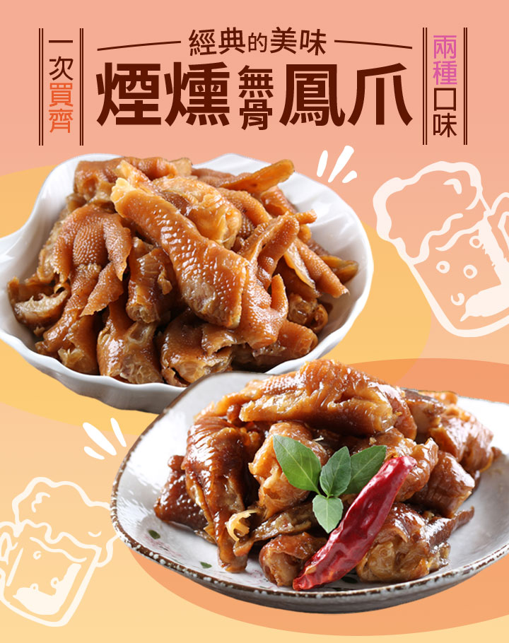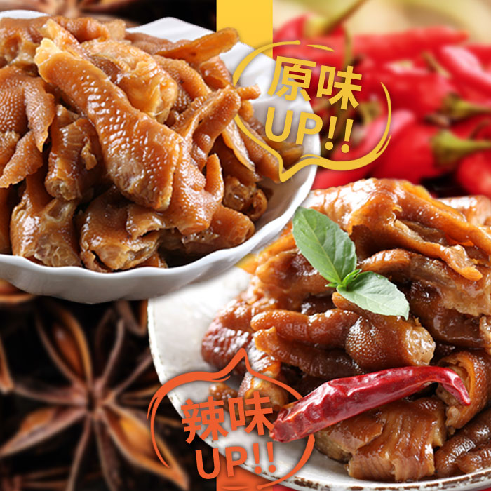 口感香Q含有豐富膠質的鳳爪,去骨後方便食用,任選兩種口味,開胃下飯,三五好友小聚、下酒、看電視最佳休閒良伴!