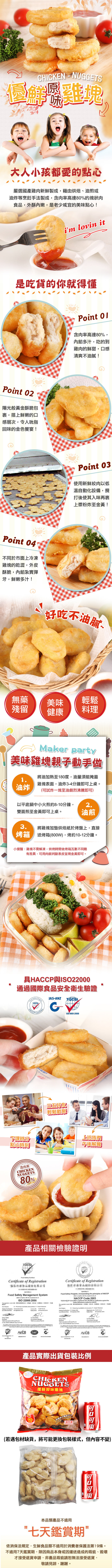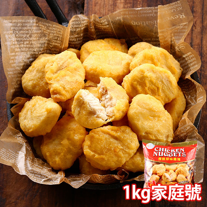 產品成份:雞肉(組合)、雞皮、裹漿粉[麵粉、玉米澱粉(非基改)、胡椒、大豆油、水解大豆蛋白(非基改)、酸性焦磷酸鈉、碳酸氫鈉、L-麩酸鈉]、精製軟棕油、大豆蛋白(非基改)、鹽、味精、馬鈴薯澱粉、玉米澱粉(非基改)、多磷酸鈉、焦磷酸鈉、偏磷酸鉀、小麥蛋白、胺基乙酸、DL-胺基丙酸、糖、琥珀酸二鈉、5'-鳥嘌呤核苷磷酸二鈉、5'-次黃嘌呤核苷磷酸二鈉、麥芽糊精、雞油、香料、酵素製劑(甘油、麥芽糖醇、谷氨酰胺轉氨酶)