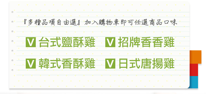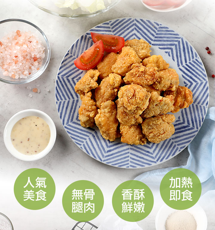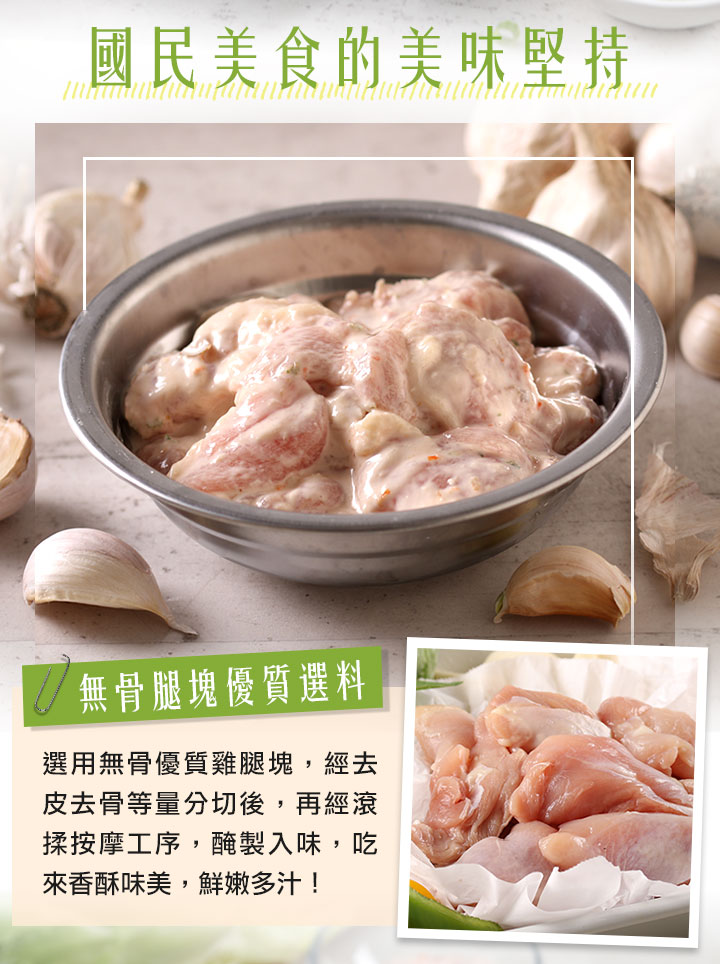 產品成份:雞腿肉、酥炸粉{樹薯澱粉、玉米粉、麵粉、麵包屑〔麵粉﹝小麥麵粉、維生素C(抗氧化劑)、澱粉水解酵素(含樹薯澱粉、糊精)、聚木醣酵素(含樹薯澱粉、麵粉)、磷脂酵素(含樹薯澱粉、麵粉)﹞、鹽、糖、酵母〕、玉米澱粉、食鹽、酸性焦磷酸鈉、蛋白粉、大豆油、碳酸氫鈉、胡椒、玉米糖膠、紅椒色素}、水、調味料(鹽、L-麩酸鈉、酵母抽出物、大蒜粉、麥芽糊精、大蒜萃取物、二氧化矽、大豆油)、磷酸二澱粉、品質改良劑(多磷酸鈉、焦磷酸鈉、偏磷酸鉀)、香料、甜味劑(D-山梨醇、蔗糖素)