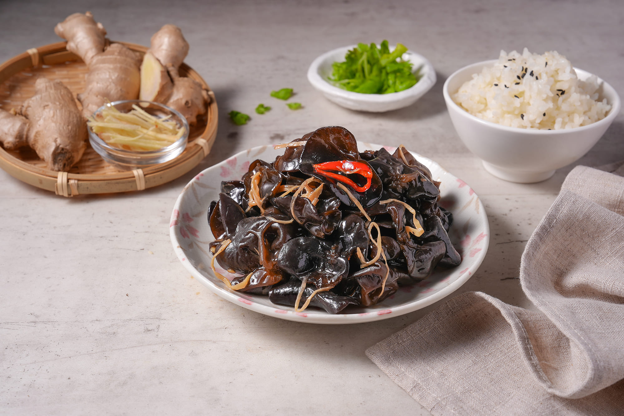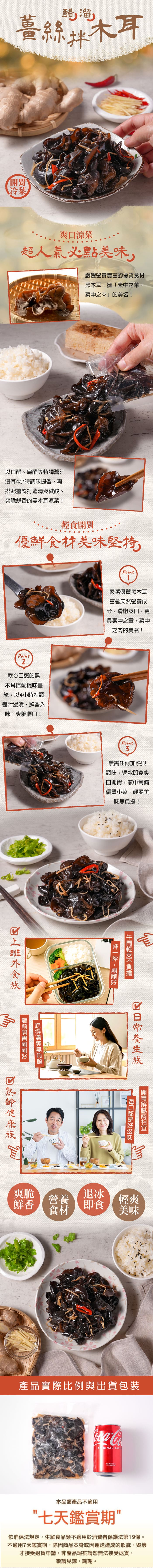 產品成分:木耳(越南)、油膏【水、轉化液糖(蔗糖、水)、非基因改造脫脂大豆片、小麥、食鹽、黏稠劑(玉米糖膠、乙醯化己二酸二澱粉)、苯甲酸(防腐劑)、酵母抽出物]、白醋【水、米、食用酒精、果糖】、烏醋【水、釀造米醋、砂糖、鹽、洋蔥、柳橙濃縮汁、番茄糊、胡蘿蔔汁、辣椒、八角、小茴香、芹菜籽、黑胡椒、丁香、焦糖色素、香料】、大豆沙拉油、薑絲、糖、辣椒、芝麻香油【大豆油、芝麻油】、鹽
