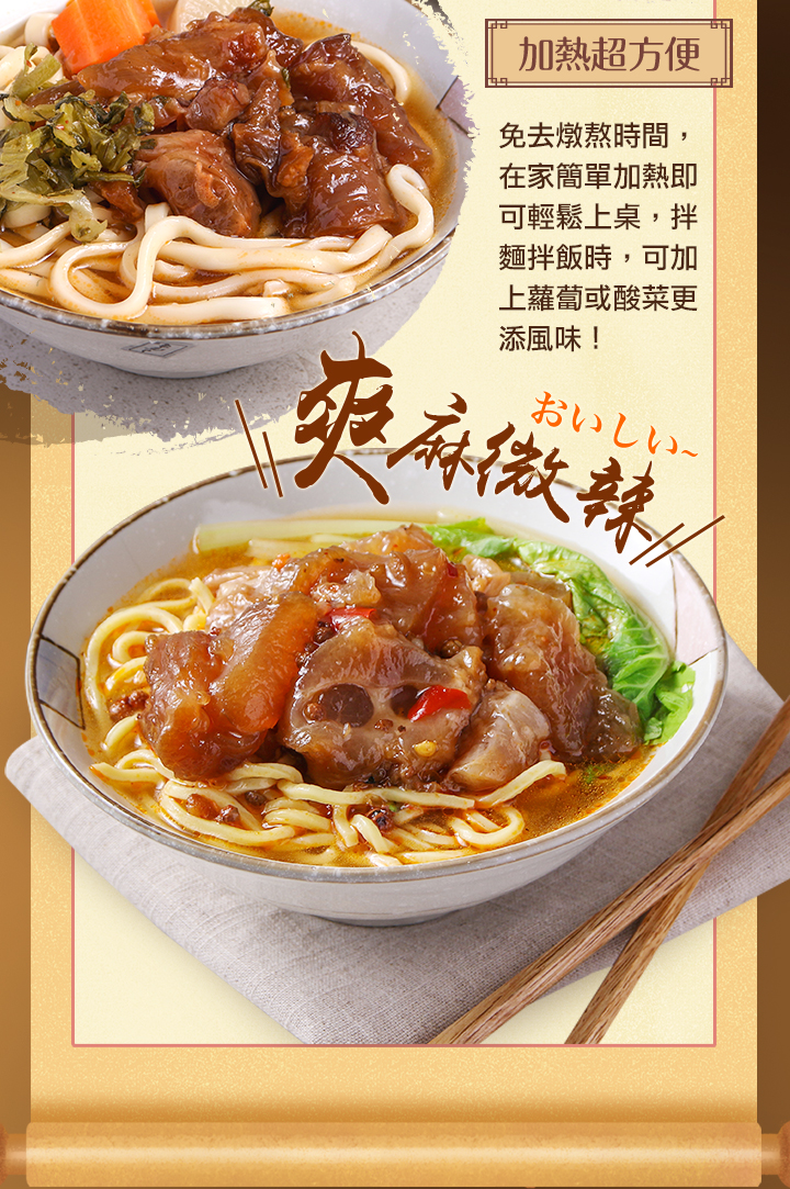 商品成分:水、牛筋(巴拉圭)、香菇素蠔油(水、轉化液糖(蔗糖、水)、非基因改造脫脂大豆片、小麥、食鹽、黏稠劑(乙醯化己二酸二澱粉、玉米糖膠)、酵母抽出物、苯甲酸鈉(防腐劑)、香菇粉)、糖、番茄醬(水、蕃茄糊、蔗糖、釀造醋、食鹽、香辛料(白胡椒、肉桂、紅辣椒、薑、丁香、肉豆蔻、芥末、月桂葉、眾香子))、鹽、粘稠劑(乙醯化己二酸二澱粉)、蒜頭、醬油、花椒、辣椒乾、蔥、滷包(小茴、花椒、陳皮、八角、桂枝、山奈、甘草、肉桂、當歸、川芎)、味鮮(L-麩酸鈉、胺基乙酸、琥珀酸二鈉、岩鹽、5'-次黃嘌呤核苷磷酸二鈉、5'-鳥嘌呤核苷磷酸二鈉)、白胡椒粉、黑胡椒粉。